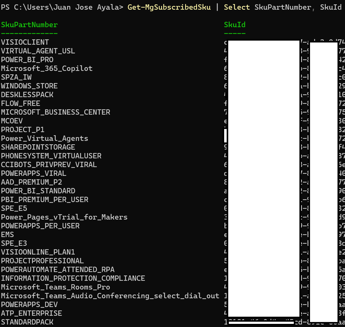 Get-MgSubscribedSku | Select SkuPartNumber, SkuId