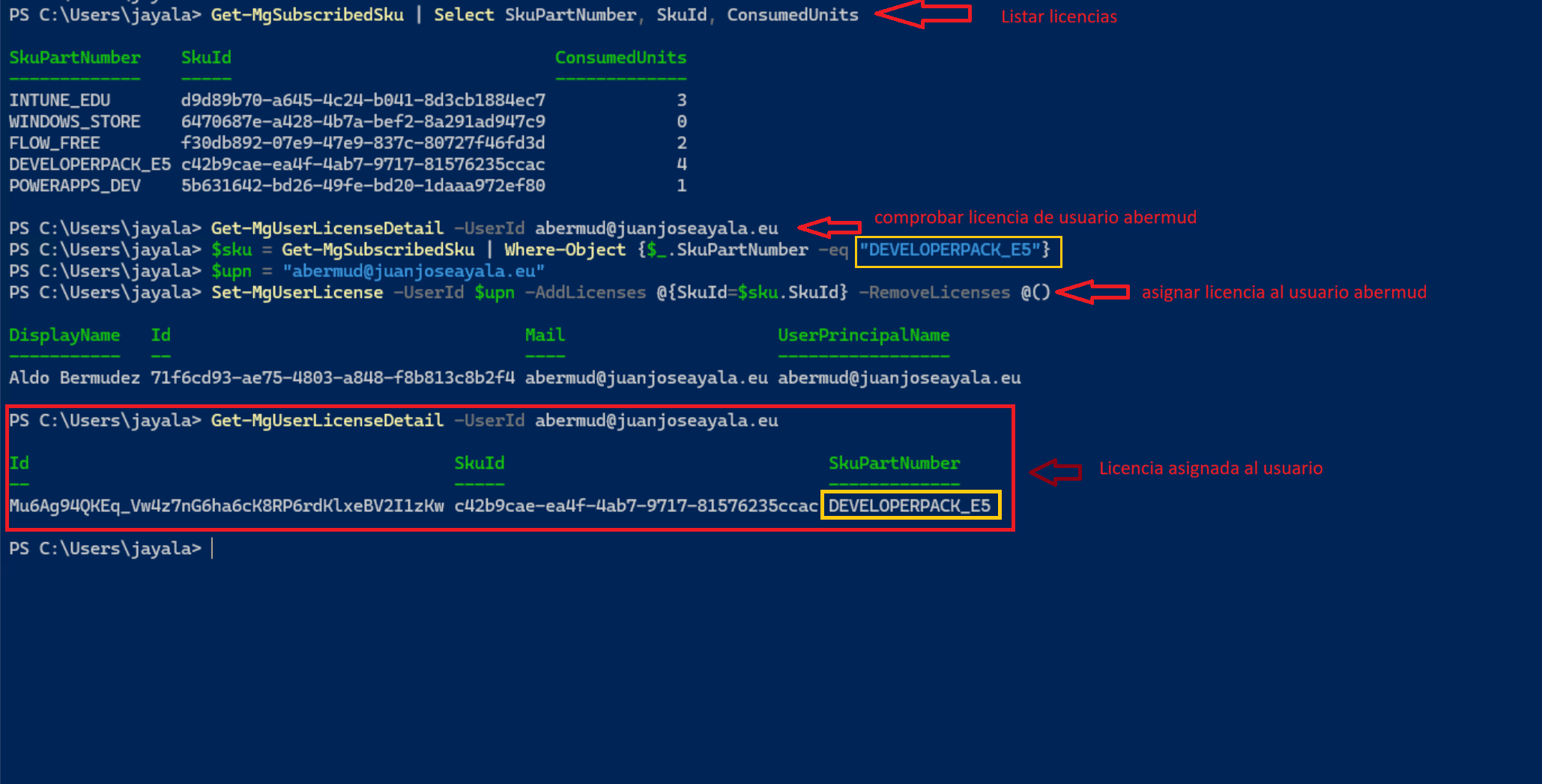 Set-MgUserLicense -UserId $upn -AddLicenses @{SkuId=$sku.SkuId} -RemoveLicenses @()